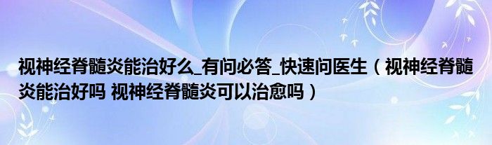 大家好,linda来为大家解答以上的问题。视神经脊髓炎能治好么_有问必答_快速问医生,视神经脊髓炎能治好吗 视神经脊髓炎可以治愈吗很多人还不知道,现在让我们一起来看看吧!
