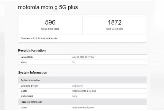 同时,这款手机还出现在基准网站Geekbench上。根据清单,该清单首先由Nashville Chatter Class网站发现,Moto G 5G Plus运行Android 10,并由八核Qualcomm SoC供电,其基频为1.8GHz。它还列出了4GB的RAM。