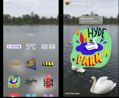 另一个新功能,这是他们可能从 Snapchat 获得的另一件事,是添加了地理贴纸。如果您正在访问或实际居住在芝加哥、伦敦、马德里和东京,您就会知道可以在您的故事中添加地理标签。如果您也对艺术家是谁感到好奇,请点击贴纸,您会看到是谁制作的。