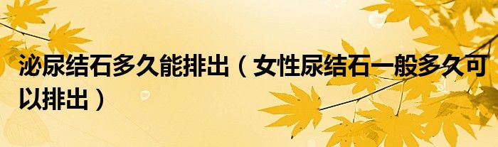 1、女性尿结石一般多久可以排出,还要结合石头的大小和位置。泌尿系结石根据结石位置可分为肾结石、输尿管结石、膀胱结石和尿道结石。输尿管结石、膀胱结石、尿道结石多由肾结石落下。一般对于女性患者来说,可以落入膀胱的泌尿系结石会很快排出体外。