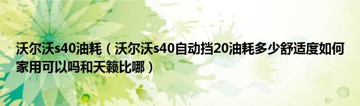 1,沃尔沃s40自动挡20油耗多少舒适度如何家用可以吗和天籁比哪:一个进口车一个合资车。。。油耗10个左右。舒适度肯定好了。进口的保养维修贵,不在乎的话绝对可以。世界上最安全的车。WOW。