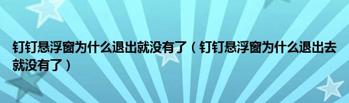 大家好,跳跳为你解答以上问题。钉钉悬浮窗为什么退出就没有了,钉钉悬浮窗为什么退出去就没有了这个问题很多人还不知道,现在让我们一起来看看吧!