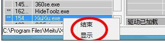 5、设置之后我们运行程序的时候就无法在自己的进程界面中查看到这个程序了!若是想要显示出来,操作的方法类似,使用鼠标右键单击程序之后选中“显示”即可!