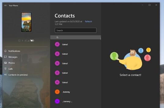 Microsoft的Your Phone在Insider频道上获得了新功能。据Aggiornamenti Lumia报道,“ 电话” 新增的两个功能是“联系人”部分和“从电话发送”部分。