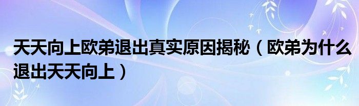 5、与公司内部有关系毕竟是一直追随这天天向上过来的粉丝 真的不希望任何一个天天兄弟离开 也不希望其他人加入即使是大牌也不喜欢 之前也听说天天向上的制片人说过欧弟会回来的 我也希望能看到欧弟尽快回到天天向上的舞台这种他们内部问题,谁能说清楚,狡兔死,走狗烹听说是被迫退出欧弟是属于暂时性离开天天向上,因为近期他有电影计划,档期和天天向上时间有所冲突,在完成电影计划后就会回归了!。